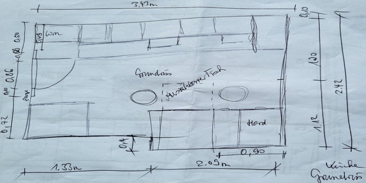 Dieses Projekt ist ein Herzensprojekt, dass im Januar 2024 mit der Planung begonnen hatte und bis Mai 2024 mit der Umsetzung abgeschlossen werden konnte. Da ich hier selbst den meisten Planungs- und Umsetzungsanteil dazu beitragen konnte, hat es besonders viel Freude gemacht und weitere Erfahrung für mich bedeutet. Neben einem Aufmaß und der Ausgestaltung des Grundrisses, ging es um die farbliche Raumgestaltung der einzurichtenden Küche. Alles beginnt jedoch mit einer Skizze.