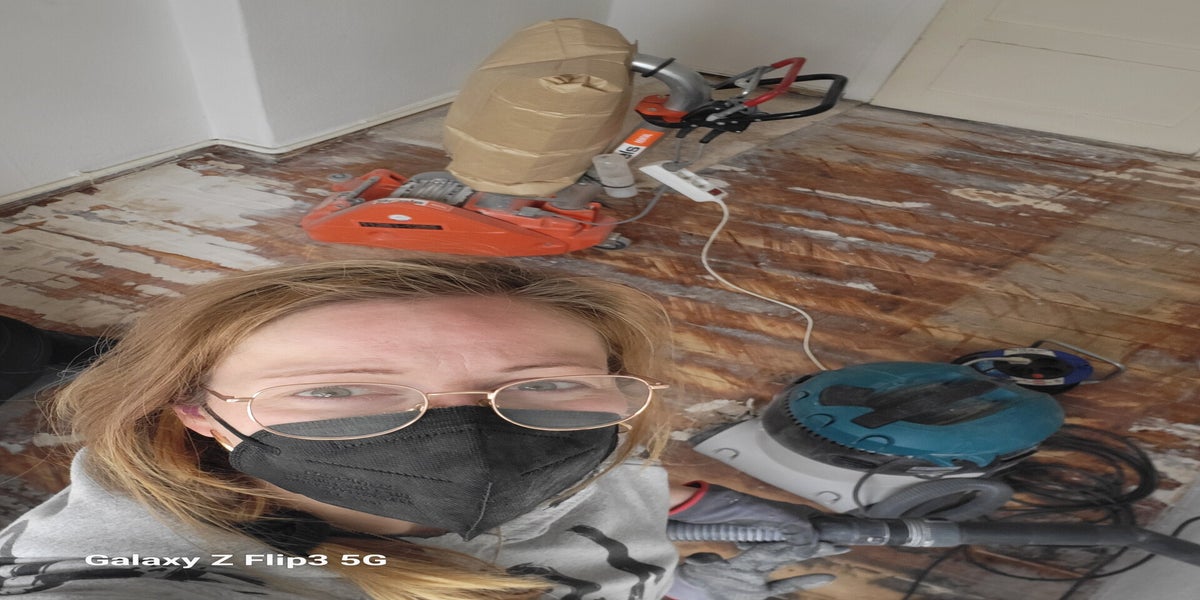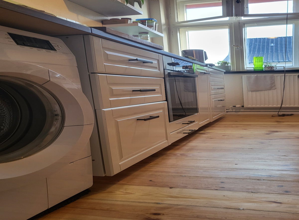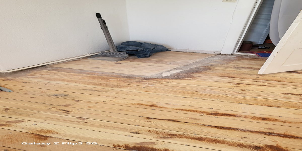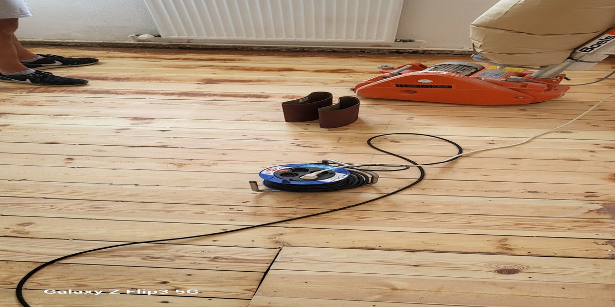Der Boden wird abgeschliffen mit einem Spezialgerät, damit die Altbaudielung gerade wird. Sonst könnten da zukünftig keine Möbel gerade stehen. Danach wird der Boden mit einem Bootslack versiegelt. Dieser Wunsch war der Kundin wichtig, da es beim Küchenfußboden um einen sehr bewegten und viel gelaufenen Bereich handelt.