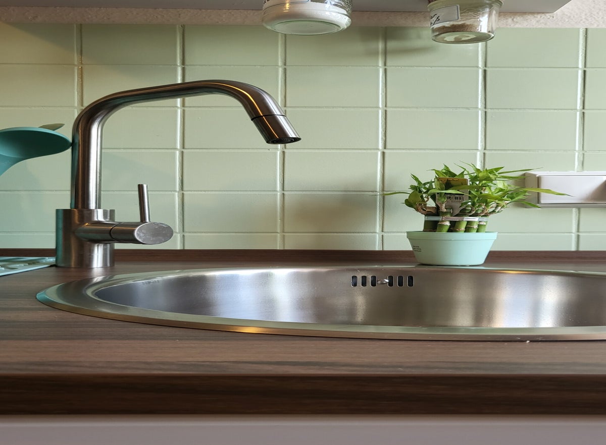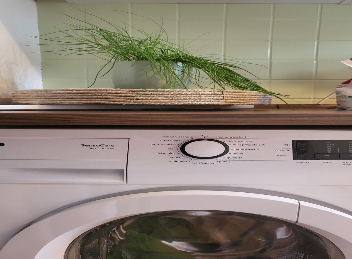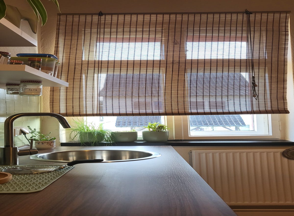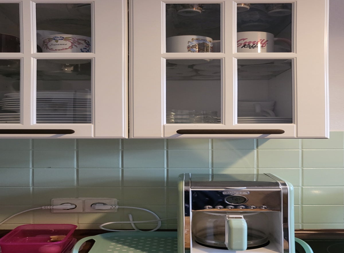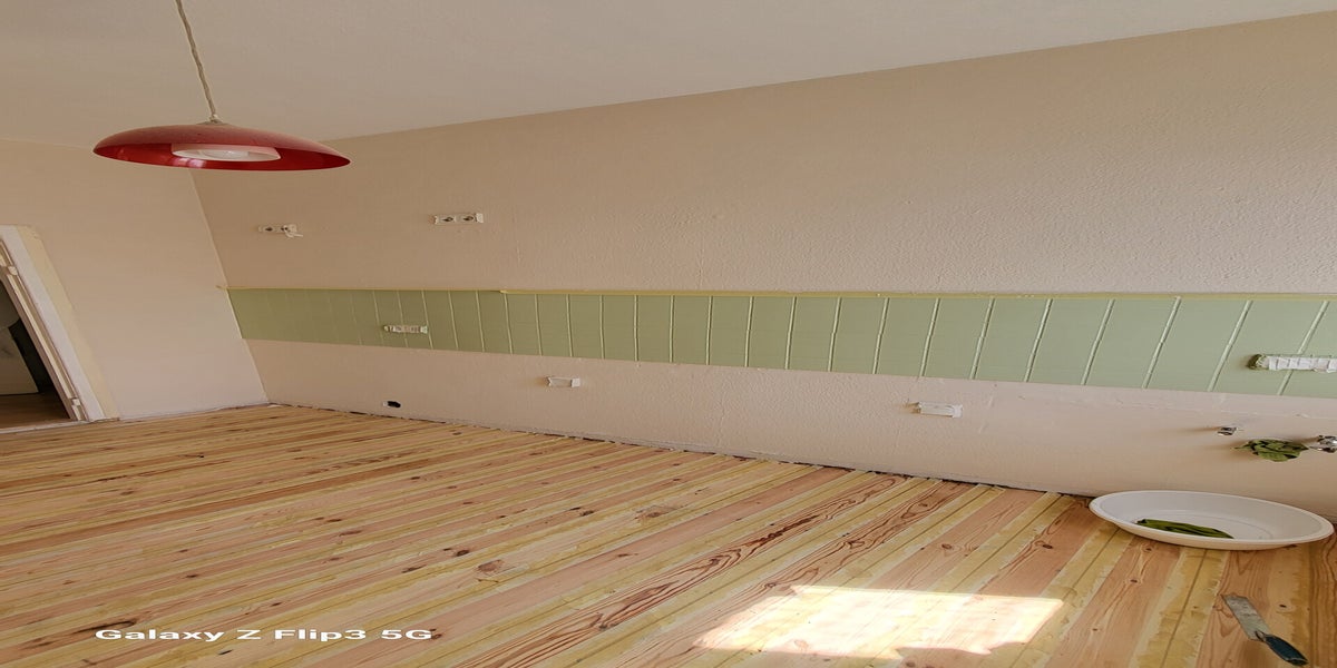 Der Fliesenspiegel war unterdessen geputzt worden, zur Vorbereitung der Lackierarbeiten. Das Konzept die Küche mit vielen grünen Tonen zu bespielen, ging damit auf. Die Fliesen werden 2 Mal lackiert. So erhaltet ihr ein sattes Farbergebnis.