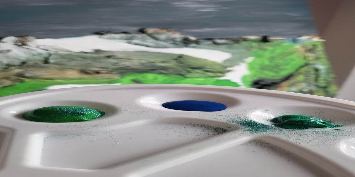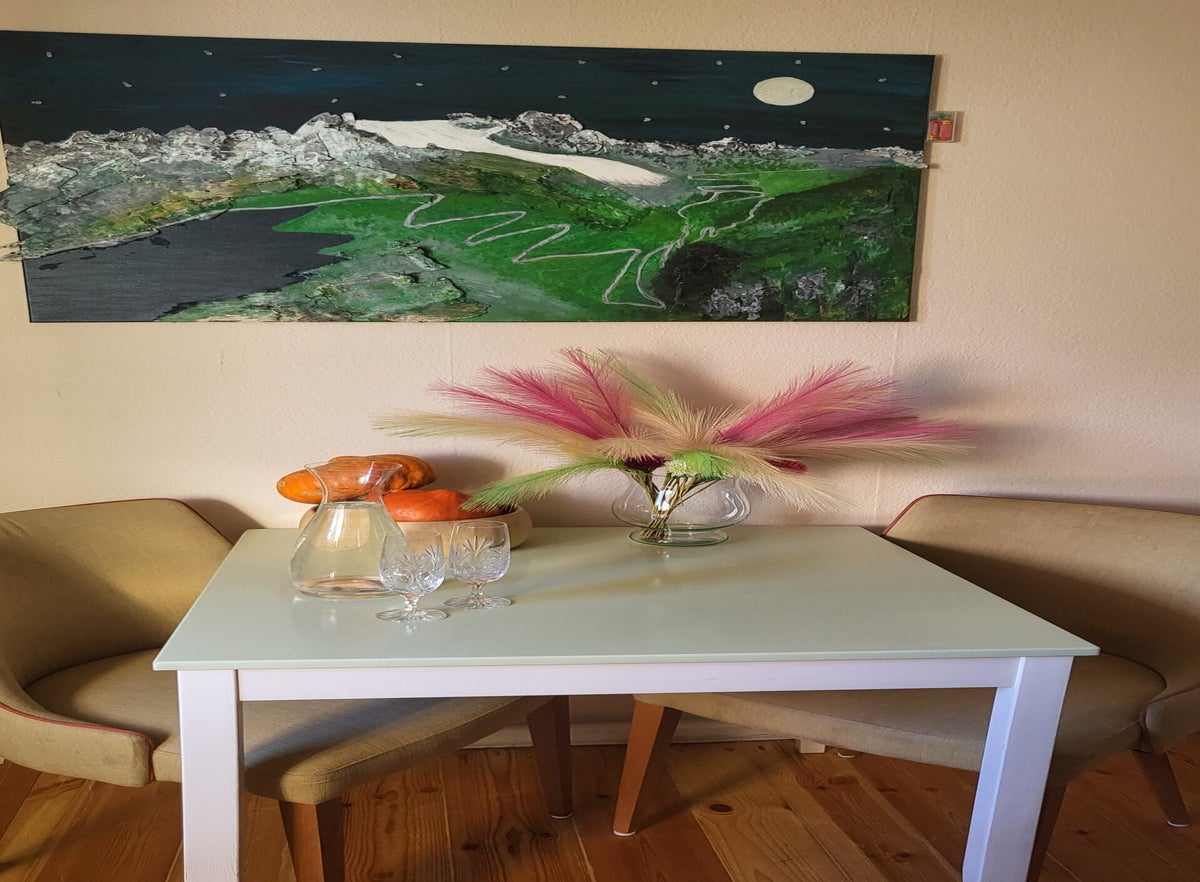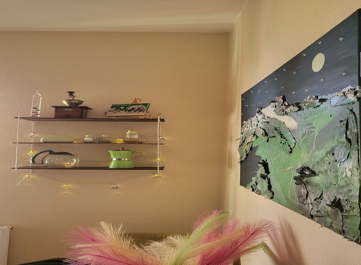 Auch die Malerei zählt zu unseren Leistungen, wenn ein Kunde dies gern in Anspruch nehmen möchte. Auf dem Bild 120 x 80 cm ist der Grimselpass in der Schweiz zu sehen. Mit Birkenborke aus dem Wald werden die Berge 3D gestaltet. Neben den Aquarellfarben und viel Glitzer, wurde eine Beleuchtung mit Sternen eingefügt. So funkeln die Sterne in der Abenddämmungen über dem Küchentisch in der neuen Küche.